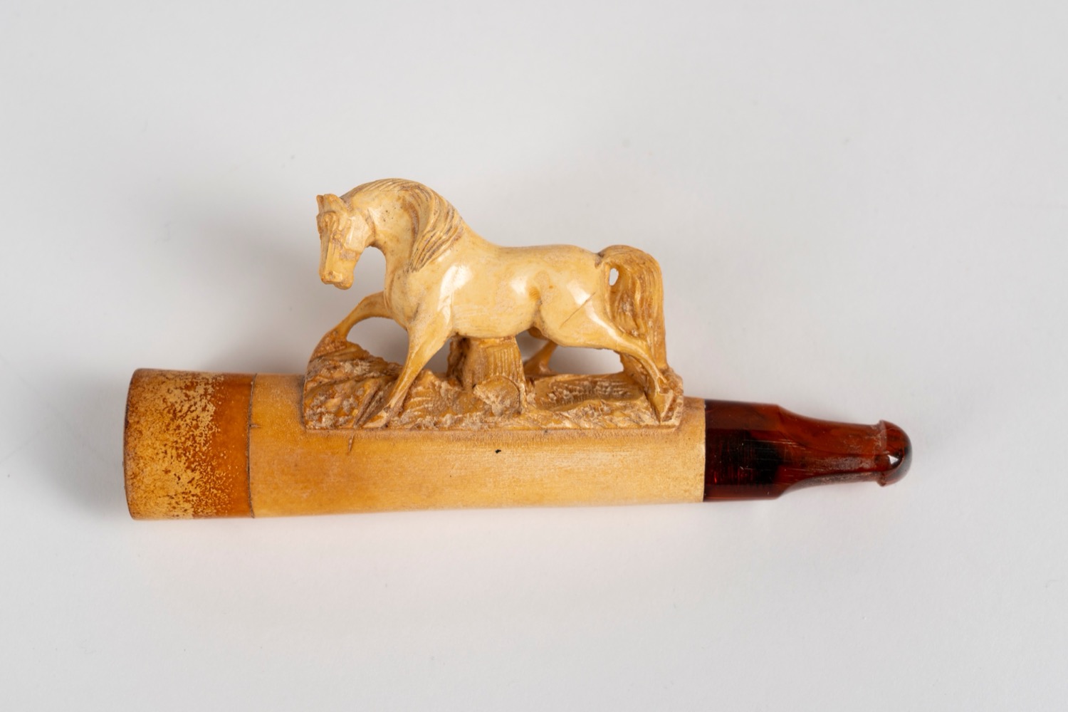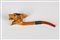 La terza pipa si trova entro custodia sagomata e raffigura un cavallo, bocchino in metacrilato. Dimensioni: l cm 9,5; h cm 4.