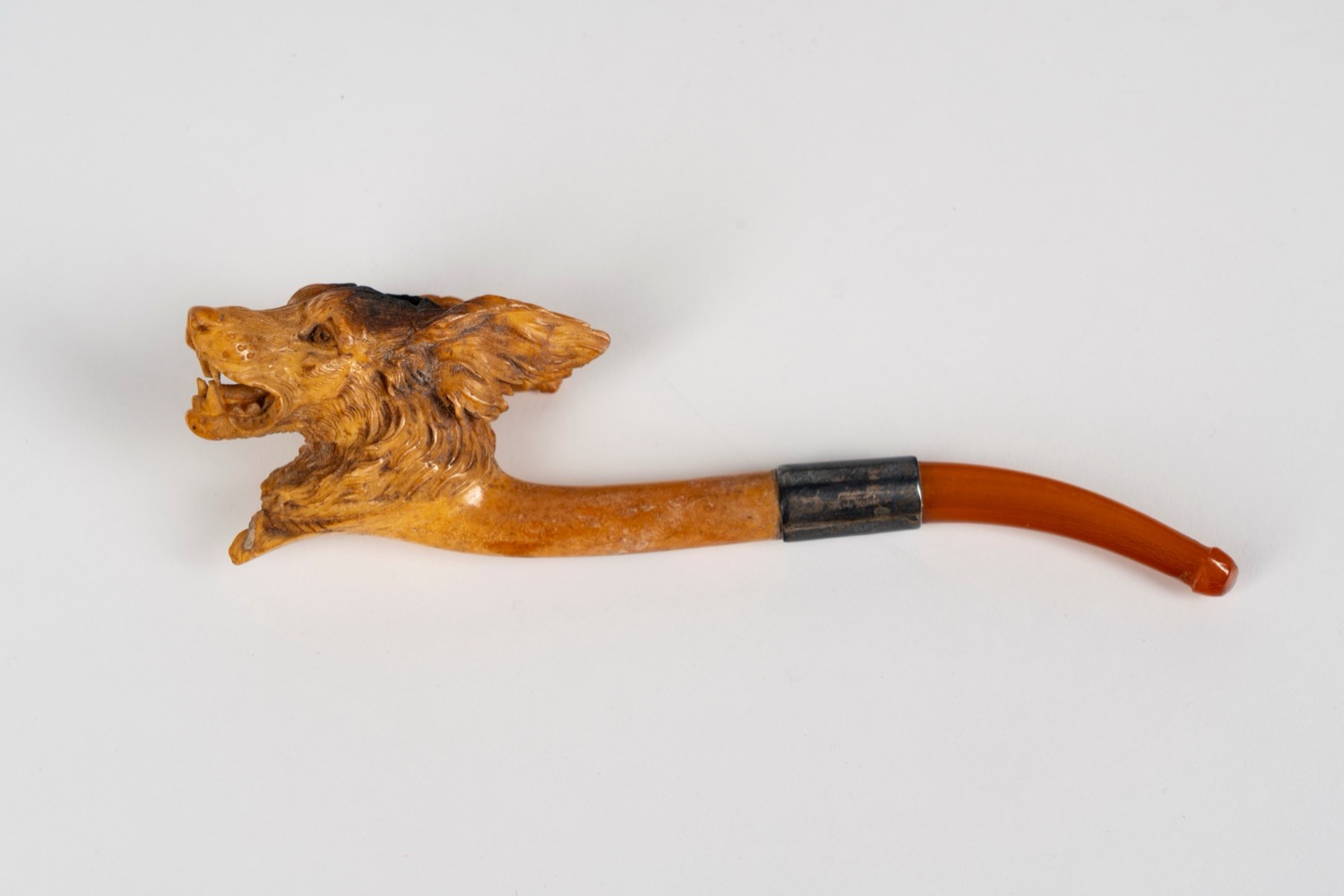 La prima pipa raffigura una testa di cane con orecchie in ascolto, anello in argento, bocchino in metacrilato. Dimensioni: l cm 13,5; h cm 4.