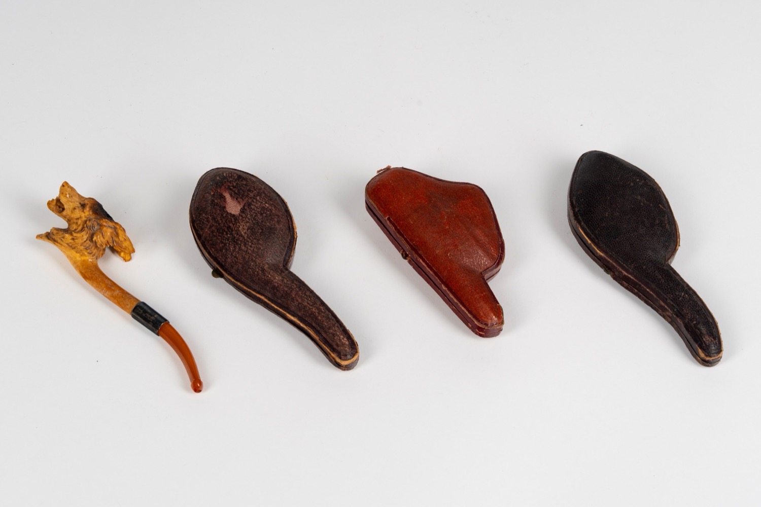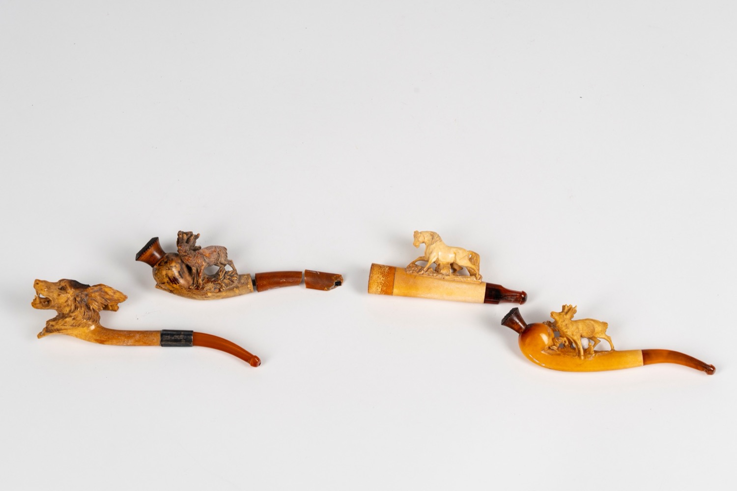 Quattro pipe in schiuma di mare intagliata raffiguranti animali. Secolo XIX