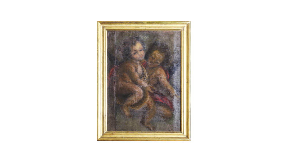 COPPIA DI PUTTI XIX secolo olio su tavoletta, in cornice, difetti cm 54,5x40 PUTTI, 19TH CENTURY, OIL ON PANEL