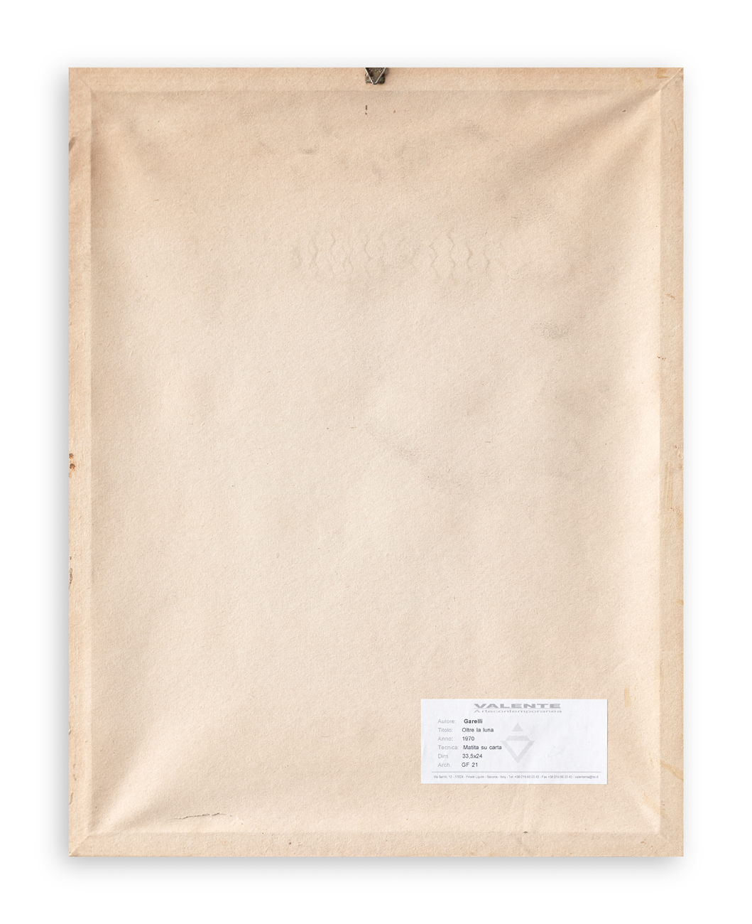 Etichetta della Galleria Valente Arte Contemporanea (SV) al retro del cartone protettivo