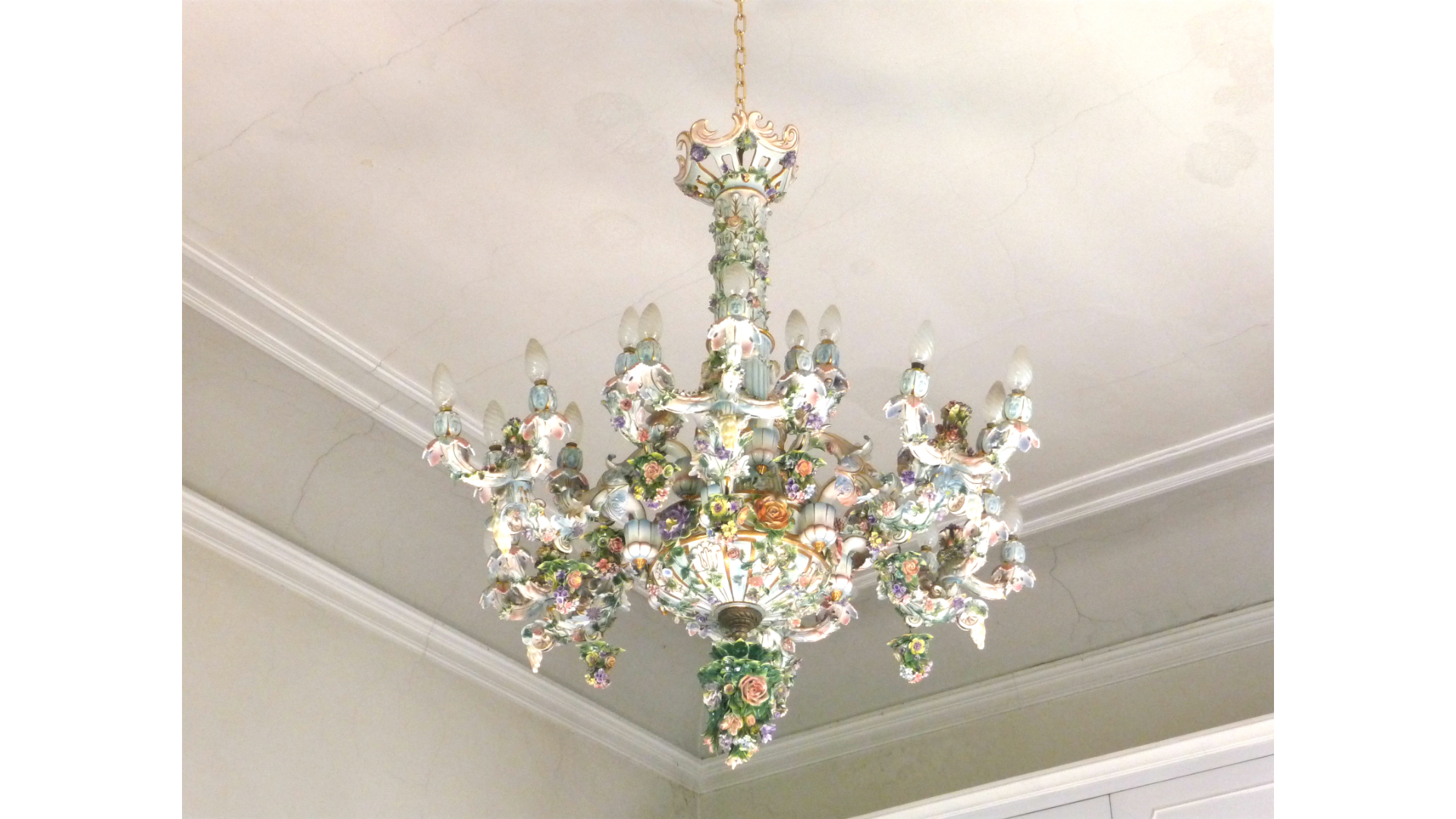 GRANDE LAMPADARIO IN PORCELLANA POLICROMA inizio del XX secolo sei bracci portacandele a tre luci ciascuno realizzato con applicazioni di fiori, foglie e grappoli pendenti PAINTED PORCELAIN CHANDELIER, EARLY 20TH CENTURY h cm 110 circa