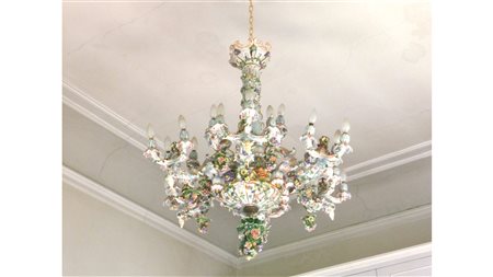 GRANDE LAMPADARIO IN PORCELLANA POLICROMA inizio del XX secolo sei bracci...