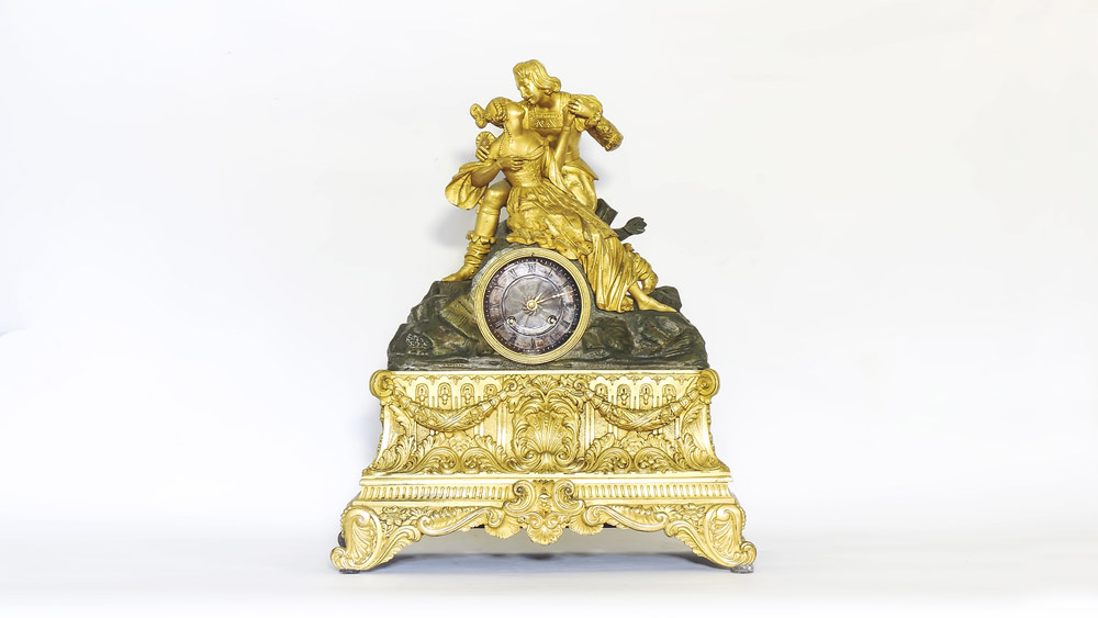 OROLOGIO DA TAVOLO IN BRONZO DORATO E PATINATO Parigi, Cailly, metà del XIX secolo sormontato da scena galante raffigurante due innamorati in abiti seicenteschi seduti su finta roccia, quadrante firmato in metallo argentato con numeri romani, alta base riccamente sbalzata con festoni, ghirlande, volute e girali, piedi a ricciolo, funzionante, da revisionare h cm 47x38x15 GILDED AND PATINATED BRONZE TABLE CLOCK, PARIS, CAILLY, MID 19TH CENTURY
