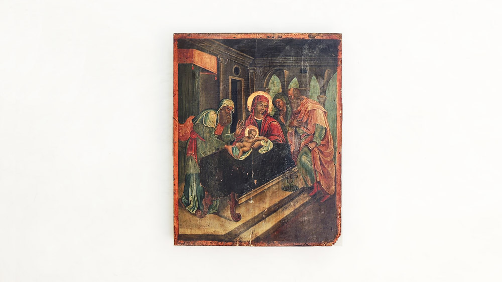 ICONA Russia, fine del XVIII/inizio del XIX secolo raffigurante La Nascita di Maria, tempera su tavola, difetti cm 35x27,5 ICON, 18TH/19TH CENTURY, TEMPERA ON PANEL (DA STUDIARE)