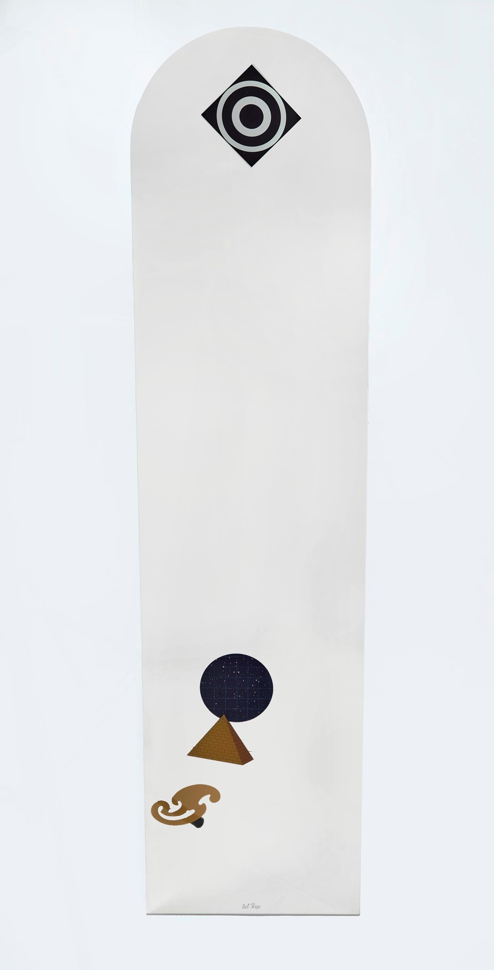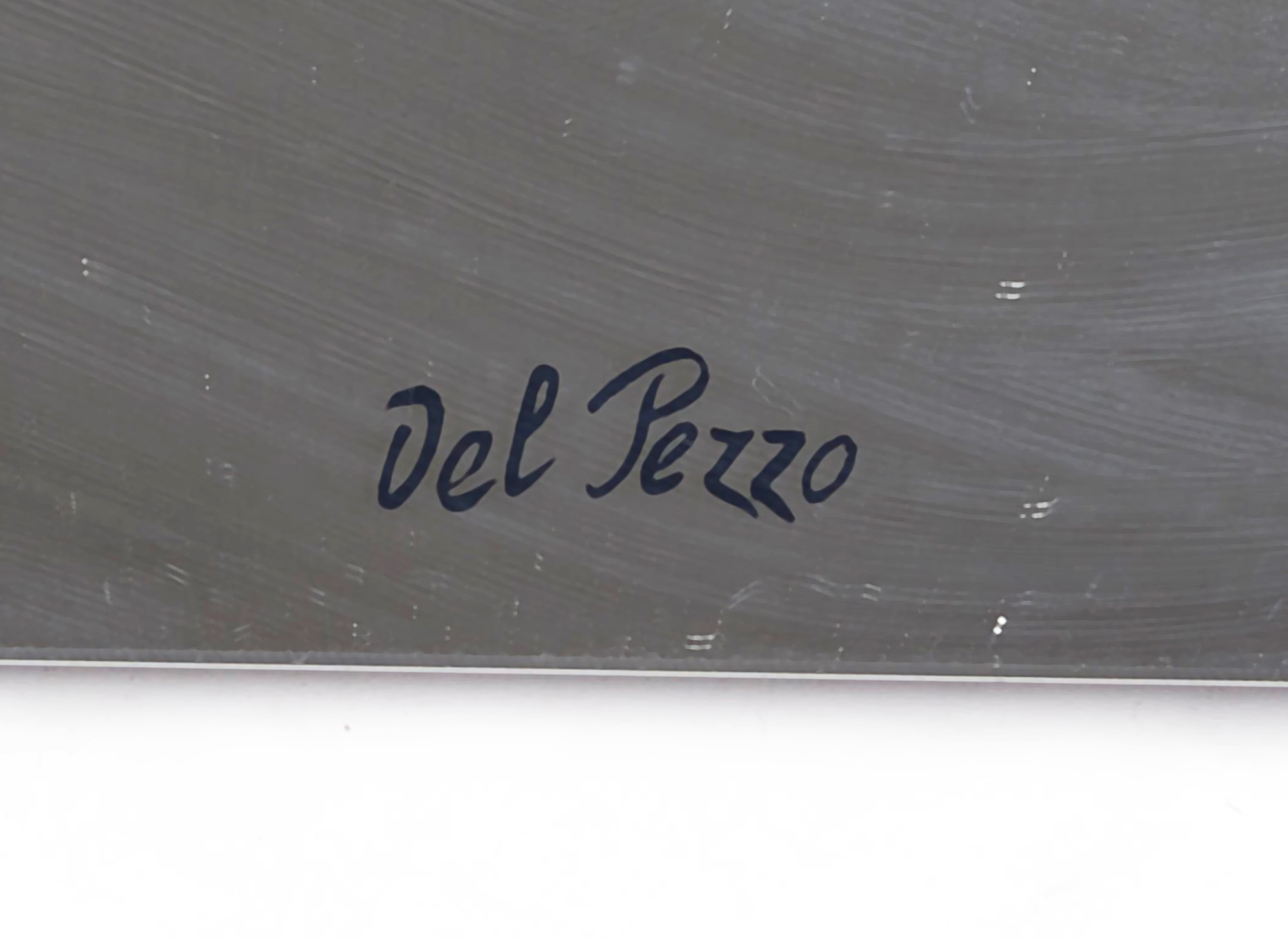 LUCIO DEL PEZZO (Napoli 1933 - Milano 2020) Specchiera con decoro a serigrafia. Prod. Rimadesio, Italia, c. 1980. Cm 160x40. Alla base reca firma Del Pezzo. Al retro reca marchio ed etichetta Rimadesio.