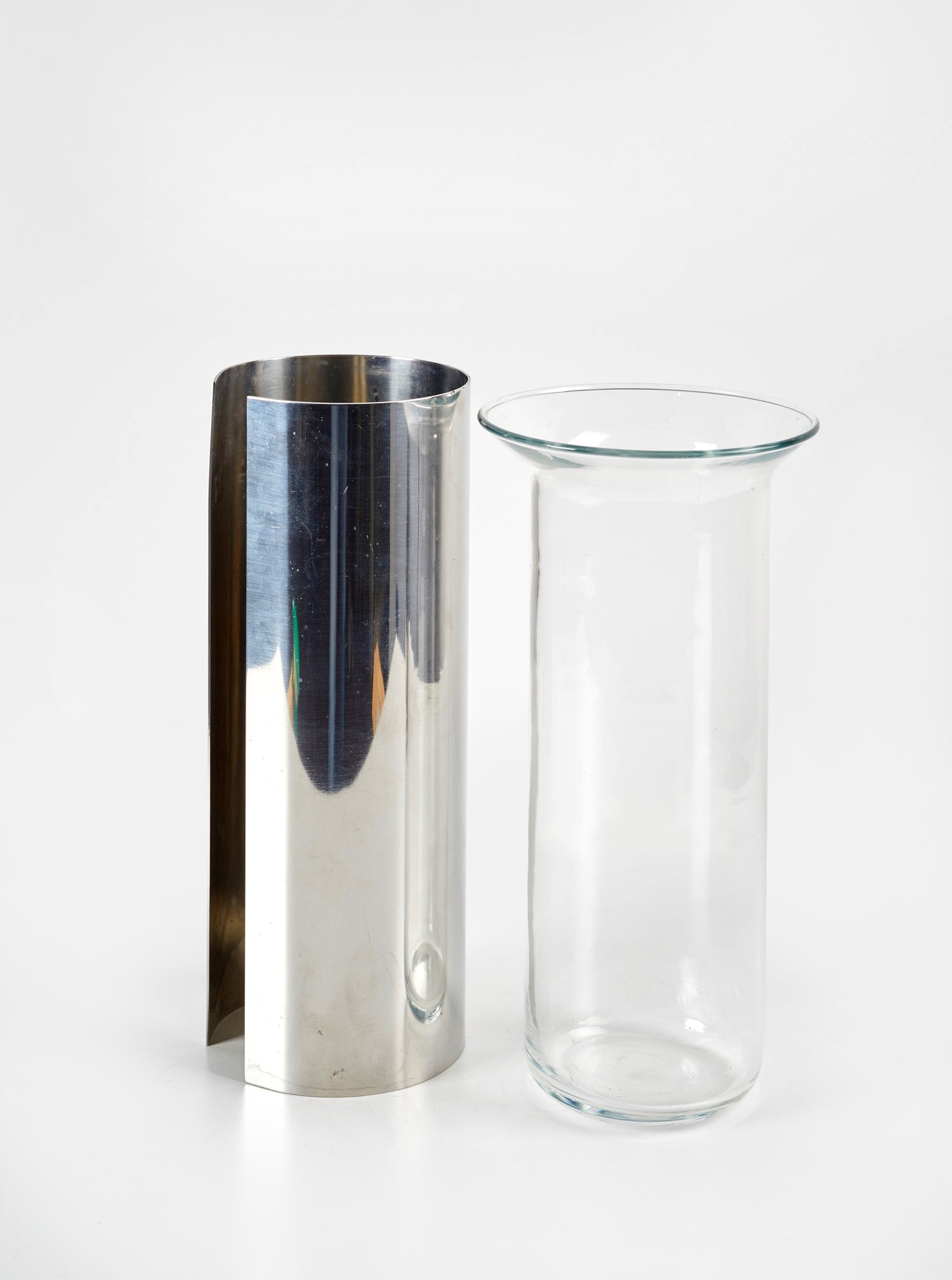 ENZO MARI (Cerano 1932 - Milano 2020) Vaso camicia in alluminio e vetro. Prod. Danese, Danimarca, I edizione, 1961. Cm 28,5x13,5ø.