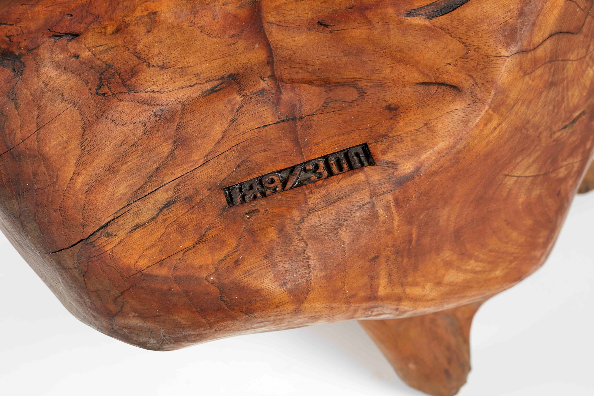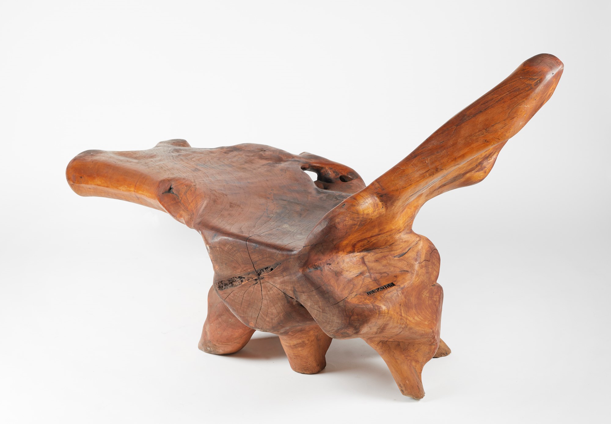 JOSE' ZANINE CALDAS (Belmonte, Brasile 1919 -  Vitória, Brasile 2001) omaggio a. Chaise longue in radice di ulivo intagliata e modellata. Prod. Italia, anni '60. Cm 91x155x74. Reca timbro a fuoco con numeri di tiratura 189/300.