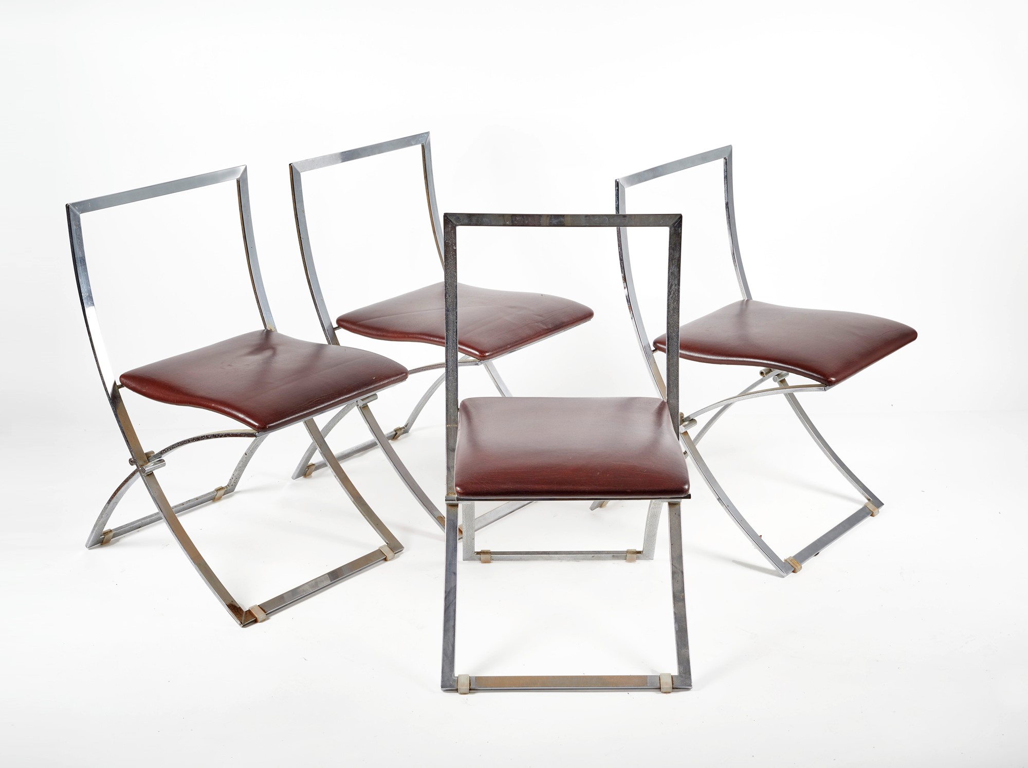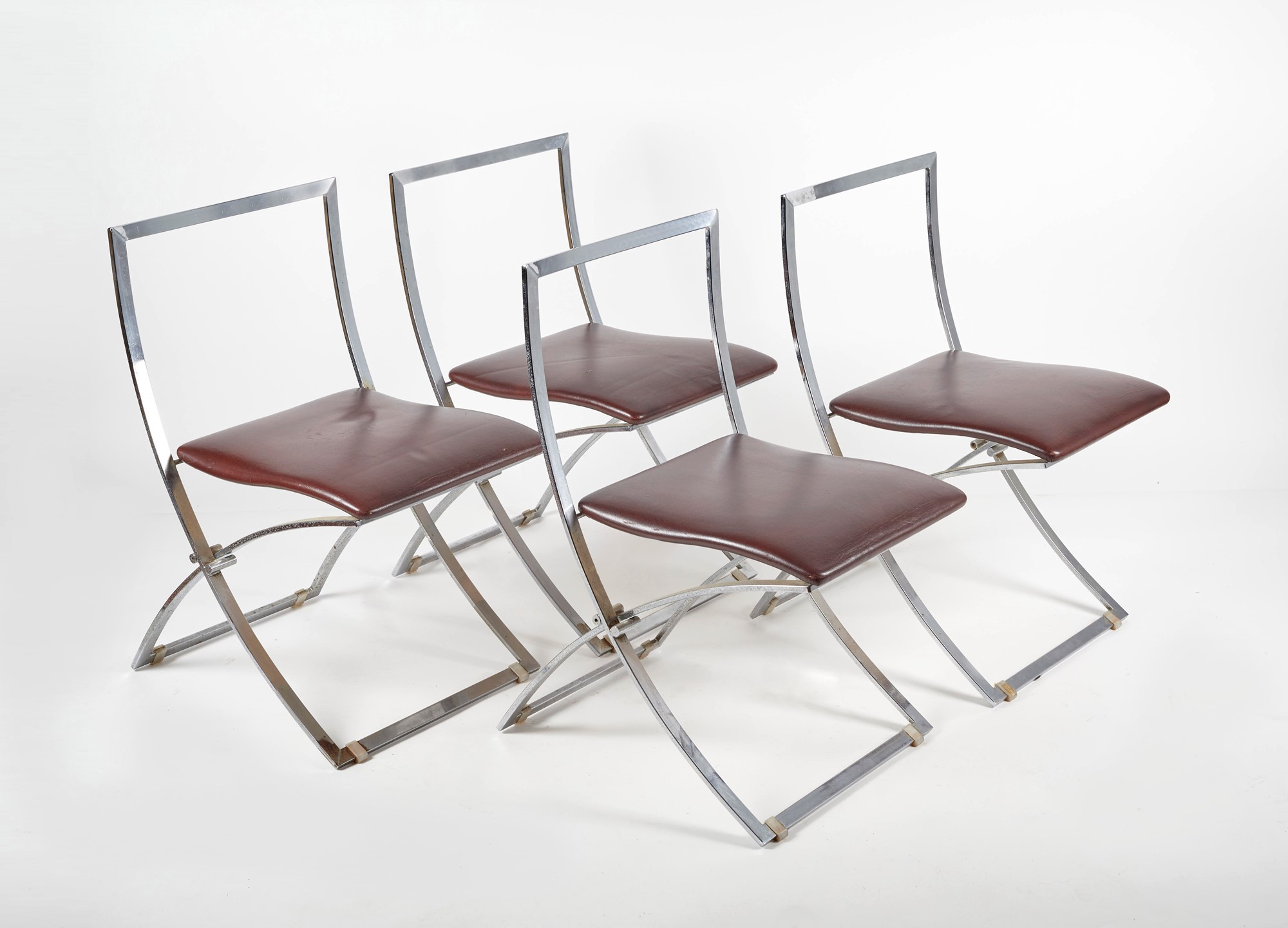 MARCELLO CUNEO (Cagliari 1933 - Cagliari 2015) Lotto composto da 4 sedie pieghevoli modello "Luisa". Struttura in metallo cromato e seduta in pelle color cuoio. Prod. Mobel, Italia, anni '70. Cm 79x60x41. (difetti)