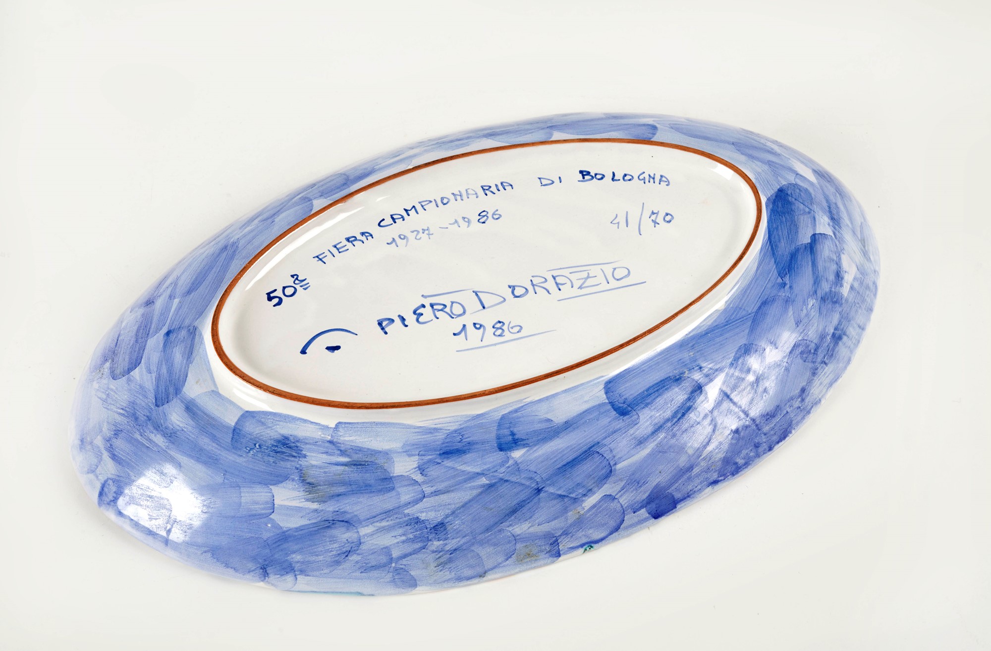 PIERO DORAZIO (Roma  1927 - Perugia 2005) Piatto in ceramica policroma. Realizzato per la 50° fiera campionaria di Bologna 1927-1986. Cm 6x46x28,5. Sotto la base opera firmata e datata Piero Dorazio 1986. Reca numeri di tiratura 41/70.