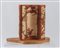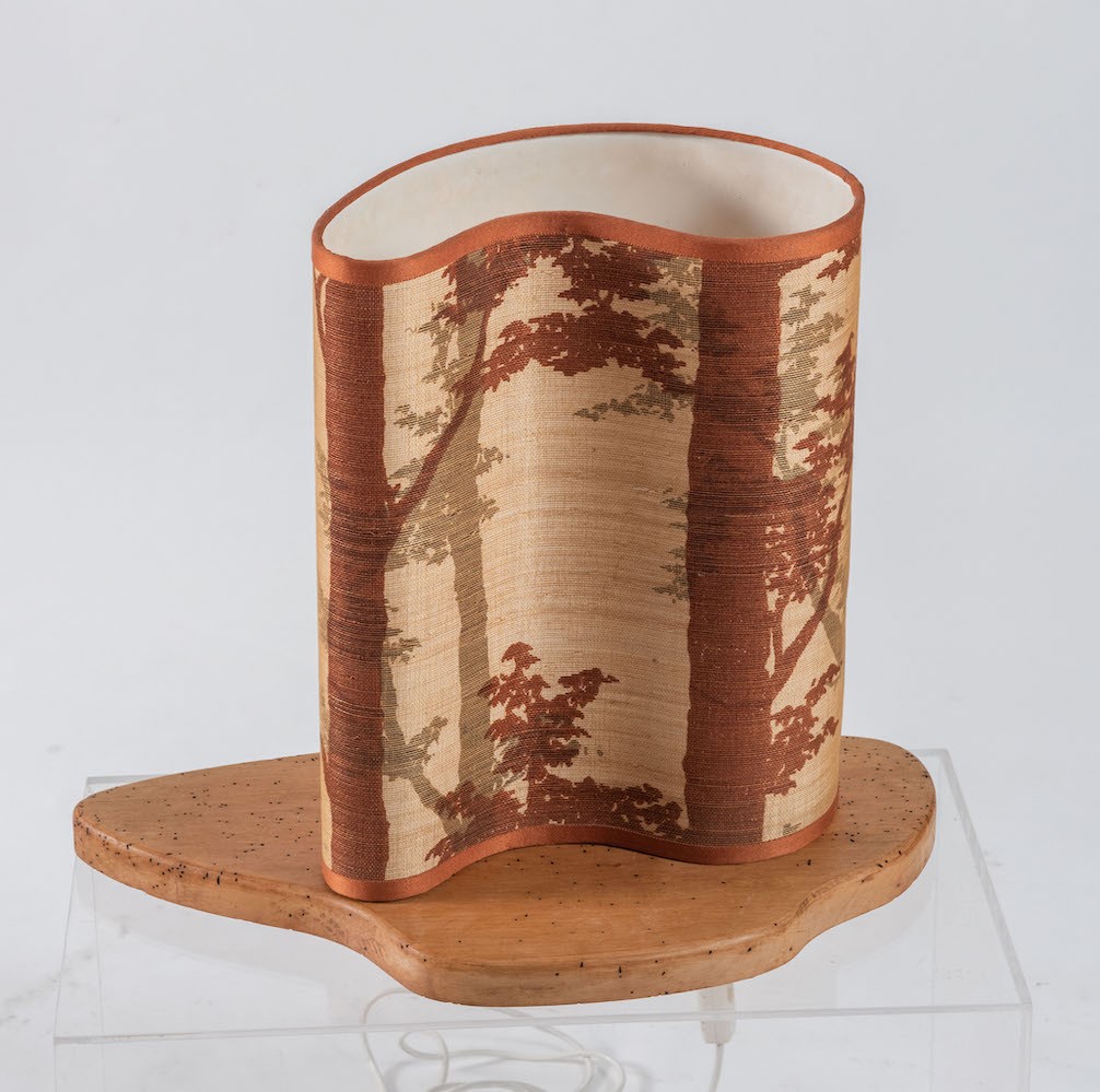 Lampada da tavolo con base in legno e paralume in tessuto. Prod. Italia, 1980 ca. Cm 43x52x28.