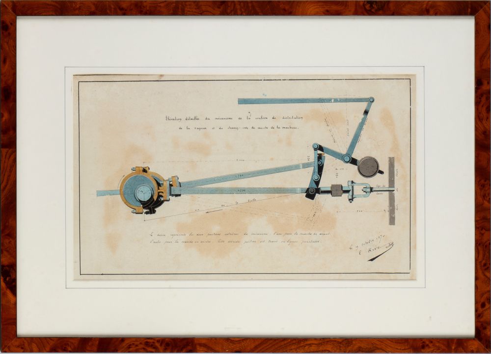 Alzato dettagliato del meccanismo della coulisse di distribuzione del vapore della macchina 1870