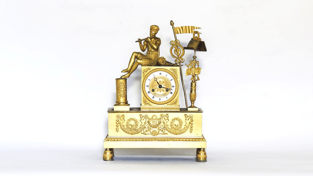 OROLOGIO DA TAVOLO IN BRONZO DORATO Parigi, Le Scieur, prima metà del XIX secolo sormontato da figura di paggio che suona il flauto con stendardo e leggio, quadrante firmato in smalto e bronzo dorato con numeri romani, base a plinto decorata con ghirlande e strumenti musicali, piedini a palla h cm 39x28x10 GILDED BRONZE TABLE CLOCK, PARIS, LE SCIEUR, FIRST HALF OF 19TH CENTURY