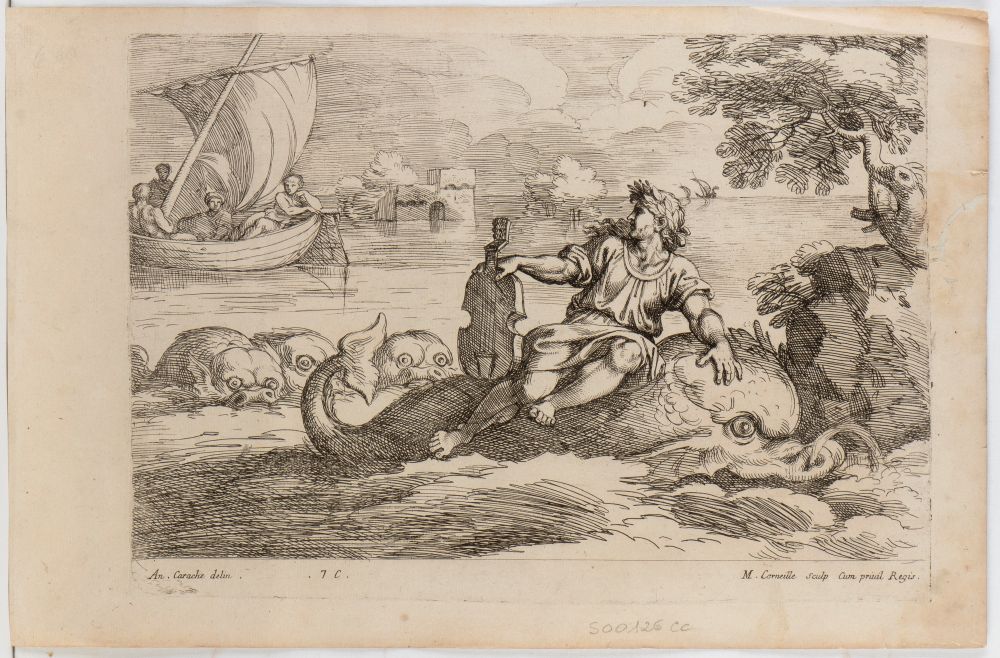 Michel Corneille (1642 - 1708) Paesaggio fluviale | Arion salvato da un delfino, da Annibale Carracci