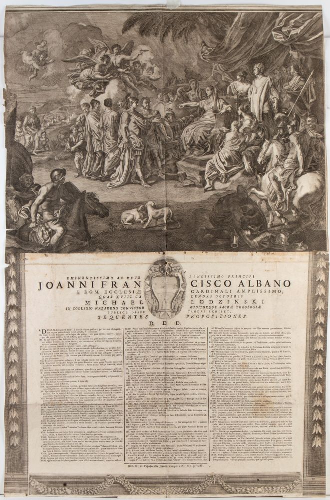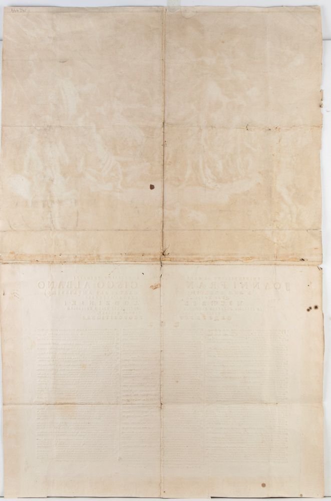 Stampata da 5 lastre (una grande con scena allegorica, 3 lastre con ornamenti e una con la stemma). Stampa di grandi dimensioni, stampata su due fogli d carta vergata uniti. Foglio in discreto stato di conservazione: un pieghe verticale e quattro pieghe orizzontali, alcuni fori al centro nella vicinanza delle pieghe e dei brevi strappi lungo i bordi, alcune lievi macchie.