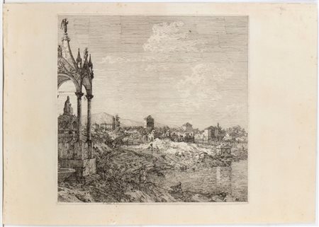 Da "Vedute altre prese da i luoghi altre ideate da Antonio Canal". Acquaforte, 301 x 215 mm (lastra), 350 x 497 mm (fgolio). II stato su 2, con le linee aggiunte. Bromberg 16.