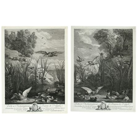 Lotto di due incisioni. Acquaforte e bulino, 412 x 305 mm ca. (cad. lastra), 425 x 325 mm ca. (cad foglio), 635 x 465 mm (cad. foglio di supporto). Stampate e pubblicate dallo stesso LeBas al suo indirizzo di rue de la Harpe a Parigi ed annunciate sul periodico “Mercure de France” nel Luglio 1756. IFF XIII.234.409-410.