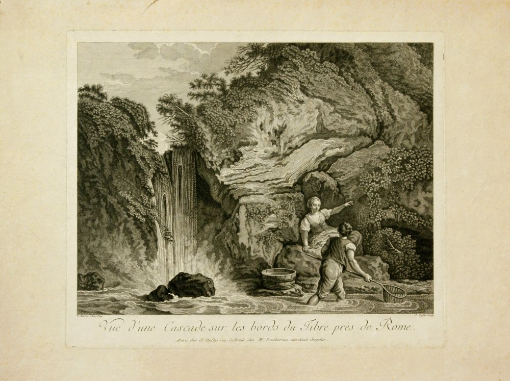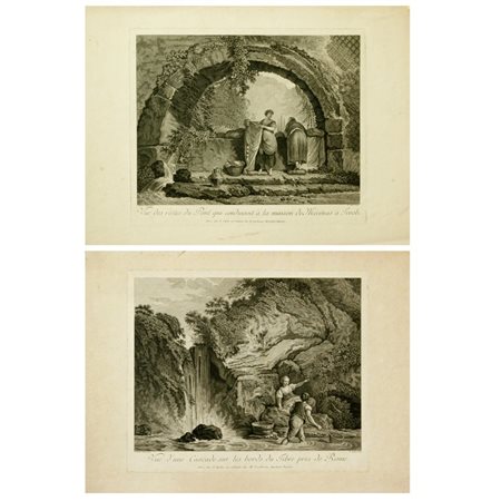 Claude Augustine Pierre Duflos (1700 - 1786) Veduta di una cascata sulle rive del Tevere vicino a Roma | Veduta dei resti del ponte che conduceva alla casa di Mecenate a Tivoli
