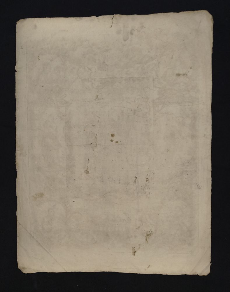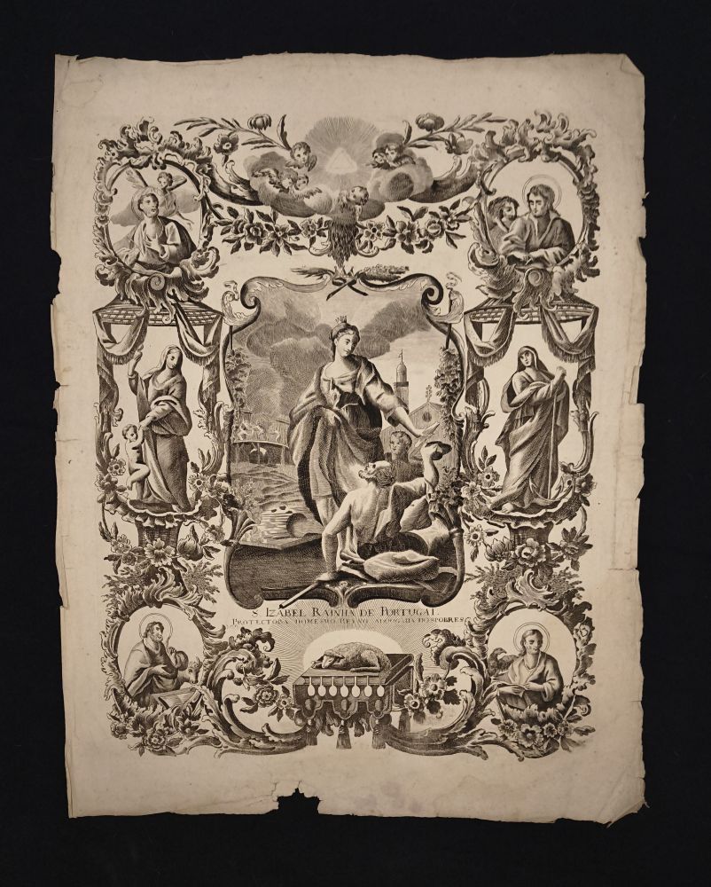 Ciascuna impressa da due lastre – lastra centrale con immagine del sento e la lastra con la cornice decorativa, stessa per tutti e tre esemplari. Stampate su carta vergata. Fogli con margini preservati. Sgualciture e difetti lungo i bordi, incluso brevia strappi. "Santa Izabel Rahina de Portuga" con una mancanza sul margine inferiore. e lievi gore. Nel complesso in buono stato di conservazione.