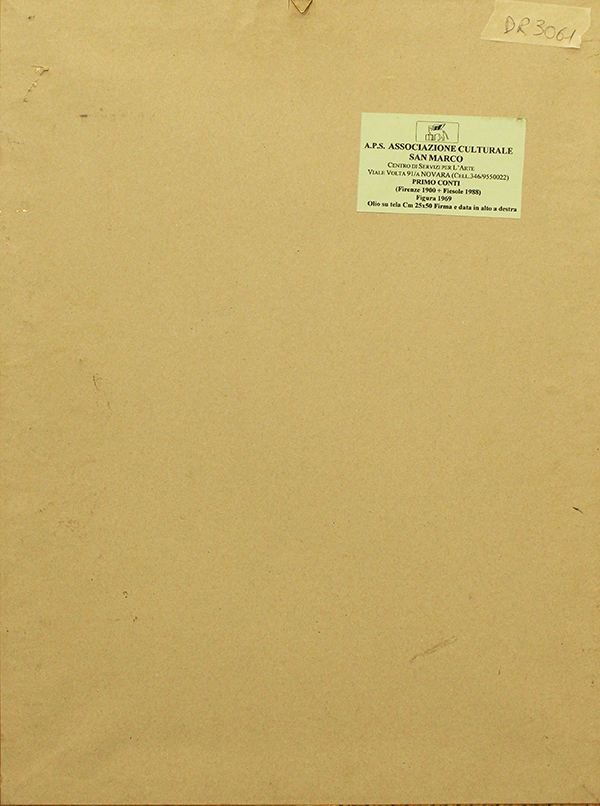 PRIMO CONTI, "Figura", 1969, olio su tela, cm 50x25, con cornice 60x44x4, peso 4 kg. Al fronte: firma e anno in basso a destra. Al verso: etichetta con informazioni dell'Associazione Culturale San Marco. Opera con certificato di provenienza della Daliano Ribani Arte. Opera con cornice in omaggio.