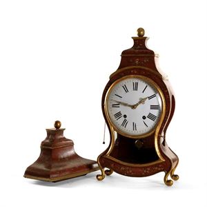 PENDOLA Cartel in legno laccato rosso e oro, Svizzera fine XVIII secolo H 82 compresa mensola Cassa in legno laccato rosso decorata in oro, quadrante in smalto con numerazione romana, lancette dorate, movimento con suoneria delle ore e delle mezze, richiamo. Completa di chiave e pendolo A wooden lacquered red and gold Carte clock, Switzerland late eighteenth century