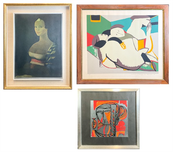 Lotto composto da una serigrafia su lastra argentata di Salvatore Fiume, una serigrafia di Remo Brindisi e una serigrafia di Vittorio Maria Di Carlo, soggetti e misure diverse