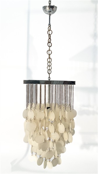 Lampada a sospensione con pendenti a disco in vetro opalescente, struttura in acciaio. Anni '70. (cm 35x125x35) (difetti e mancanze)
