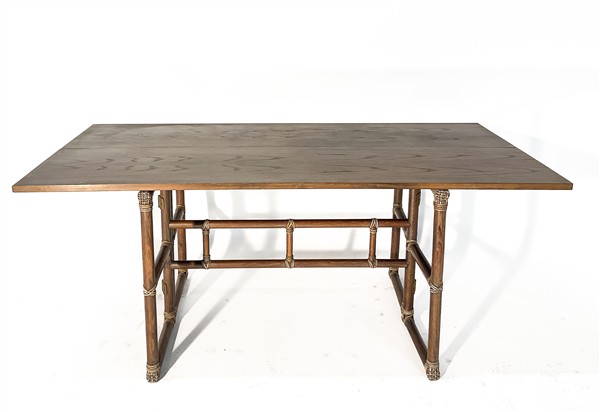 Tavolo console apribile a libro con struttura in legno massello imitante il bambù e piano in legno impiallacciato, inserti in ottone. Produzione McGuire Company, Milano, anni '70. (cm 180x75x90) (difetti)