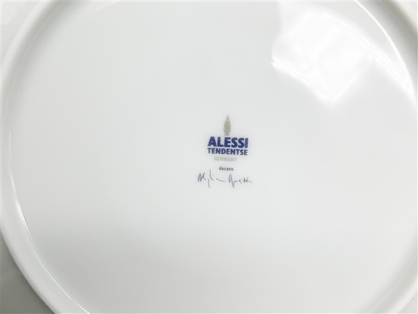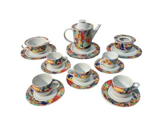 Servizio da caffè in porcellana serigrafata in policromia. Produzione Alessi, Germania, anni '70. Composto da caffettiera, zuccheriera con coperchio, lattiera, sei tazzine con piattini e sei piattini da dessert. Marcati e firmati in blu sotto la base. (mancanze)