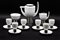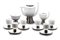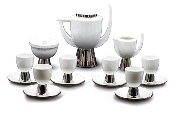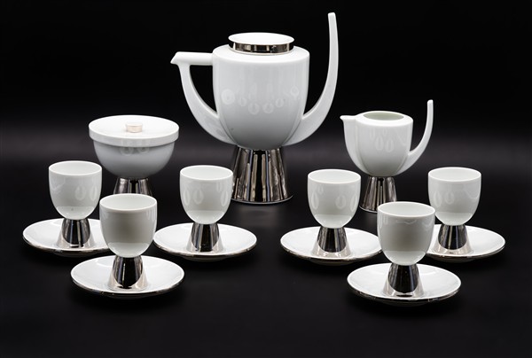 Manifattura di Limoges, J.L.Coquet, Forme Cosmos. Seconda metà secolo XX. Servizio da caffè in porcellana bianca con fasce decorate in platino composto da caffettiera, zuccheriera con coperchio, lattiera e sei tazze con piattino. Marcati sotto la base. (h max cm 25) (lievi difetti)