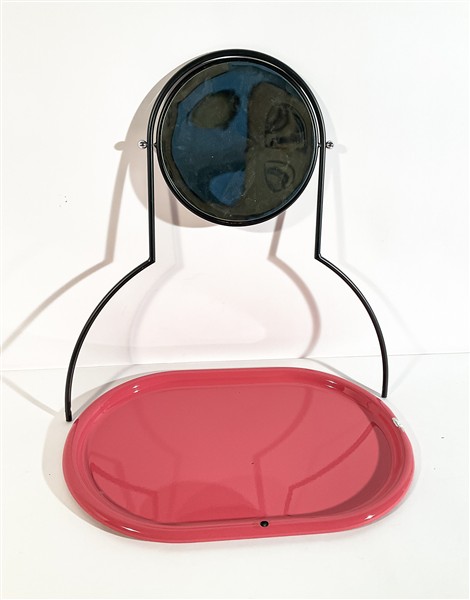 Lotto composto da un vassoio della Progetti in metallo smaltato rosa e una parte di uno specchio da montare su base mancante. (difetti e mancanze)