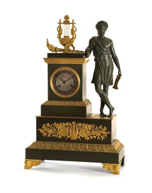 PENDOLA Pendola in bronzo dorato e brunito, Francia epoca Carlo X H 53 Cassa in bronzo brunito con inserti in bronzo dorato, quadrante argentato con numerazione romana, movimento parigino con suoneria delle ore e delle mezze su campanello. Completa di chiave e pendolo. A French Charles X bronze clock