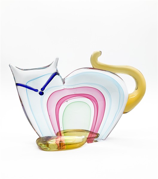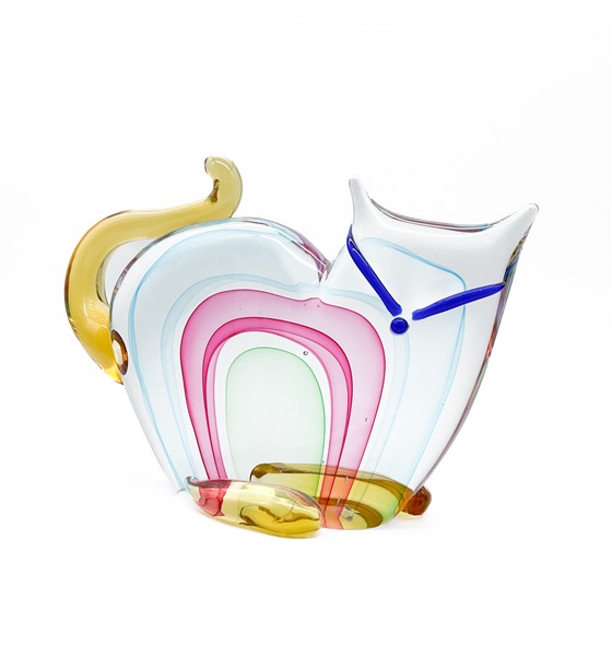 Scultura a forma di gatto in vetro soffiato sommerso policromo. Seconda metà secolo XX. (cm 32x23) (lievi difetti)
