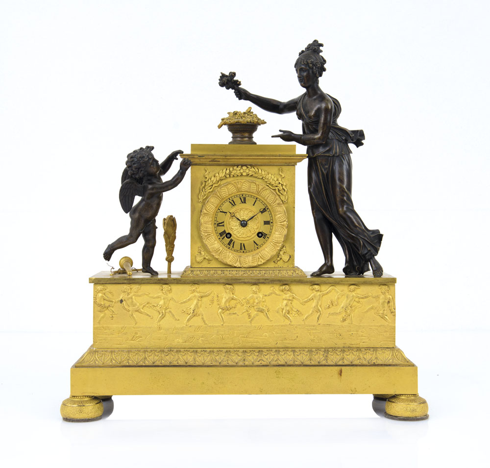 PENDOLA DA TAVOLO IMPERO IN BRONZO DORATO E BRUNITO, INIZIO XIX SECOLO, cassa a plinto, fronte a bassorilievo con putti danzanti reggenti festoni di fiori, sormontata da figura femminile allegorica e putto; quadrante con numeri romani; da revisionare.