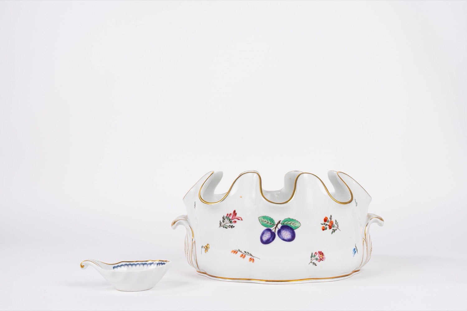 Lotto composto da grande rinfrescatoio e salierina in porcellana decorata a frutti, Richard Ginori, manifattura di Doccia, Florence
