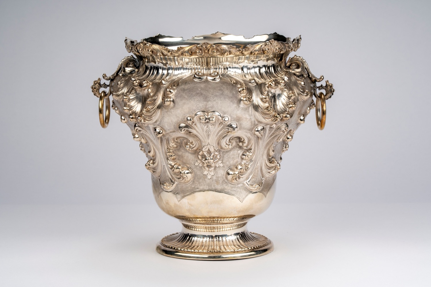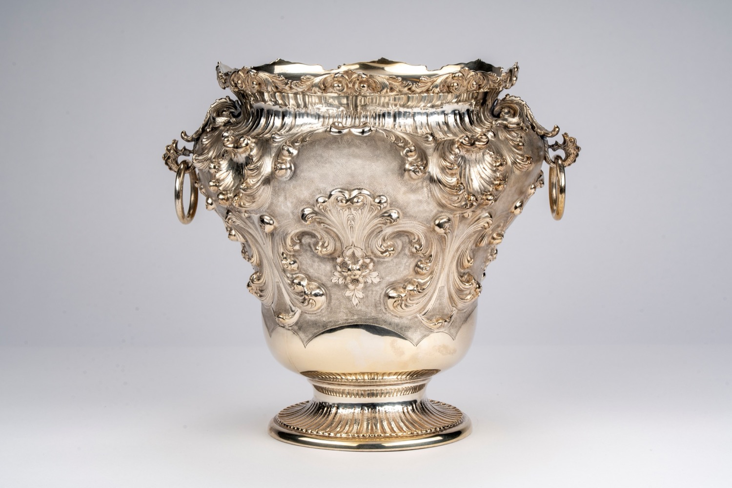 riccamente sbalzato a volute e foglie stilizzate su sfondo inciso, bordo superiore sagomato, anse laterali a teste di animale fantastico con anelli circolari e piede tornito.