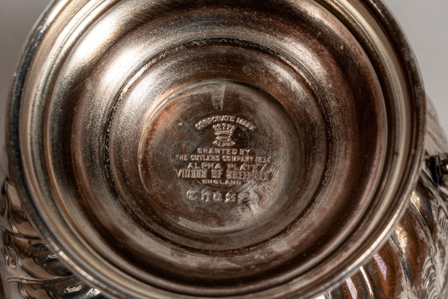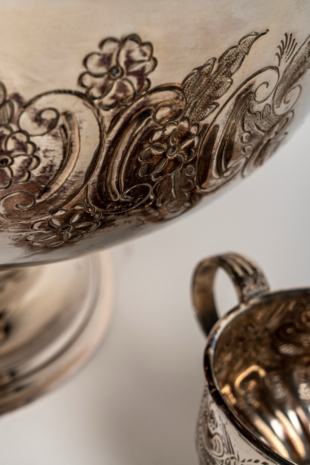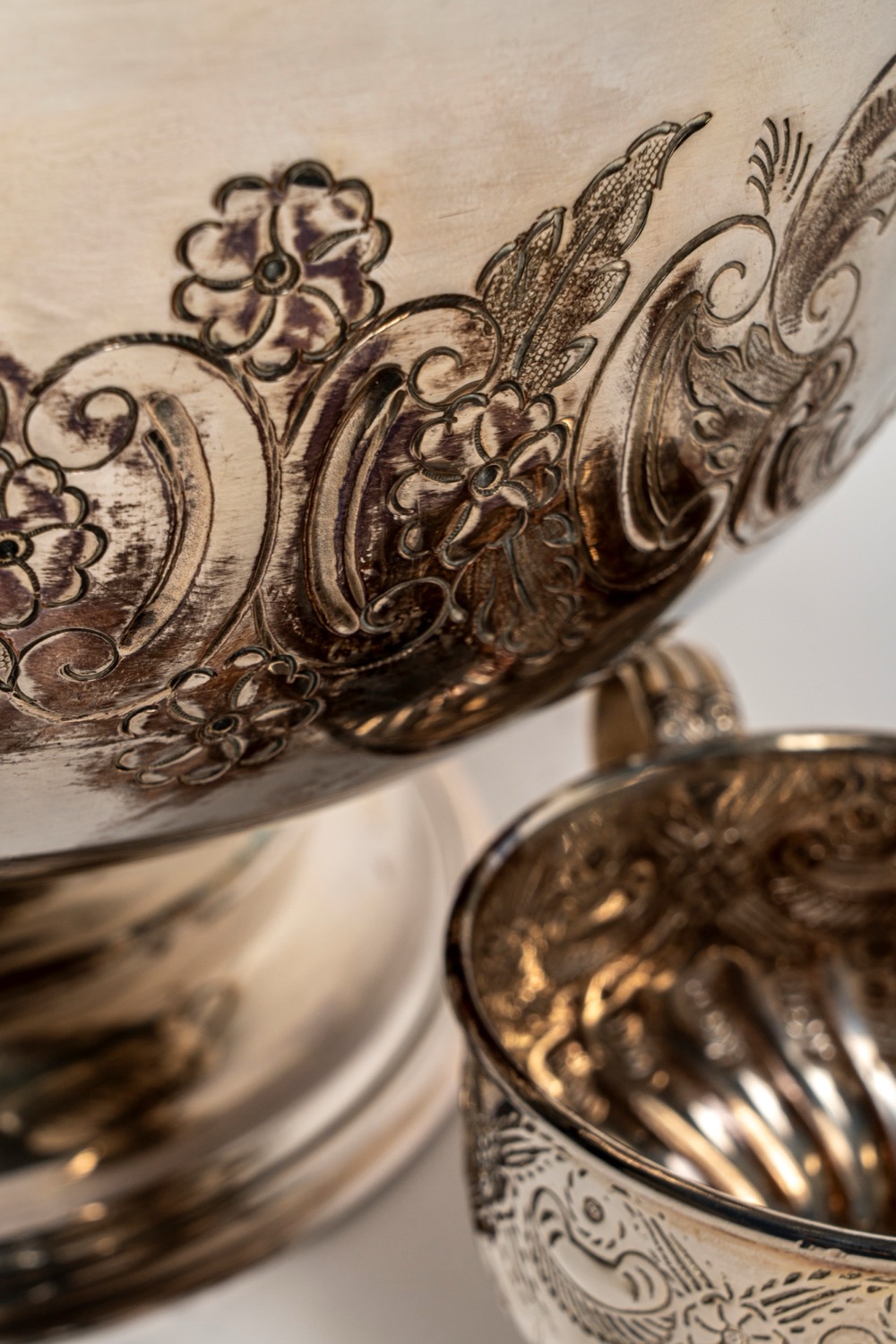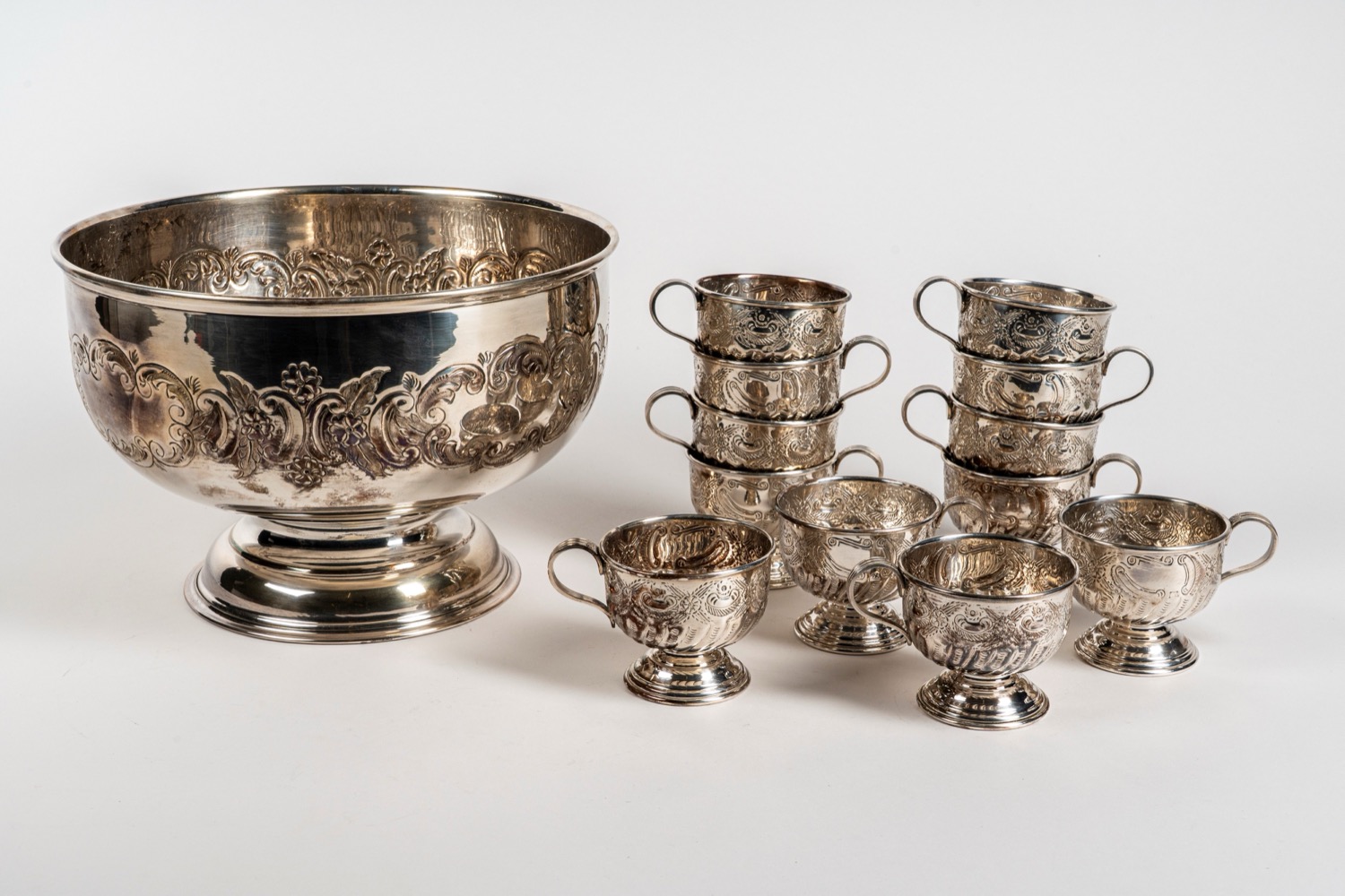 composto da zuppiera e 12 tazze con corpo sbalzato a fiori e volute.
