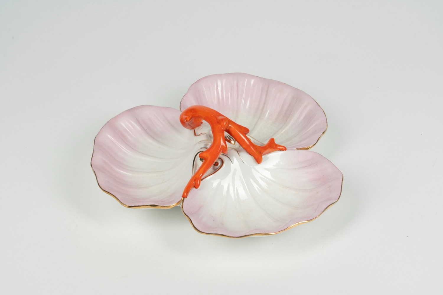 in forma di tre valve di conciglia con presa a ramo di corallo. Una felatura passante.in forma di tre valve di conciglia con presa a ramo di corallo. Una felatura passante.