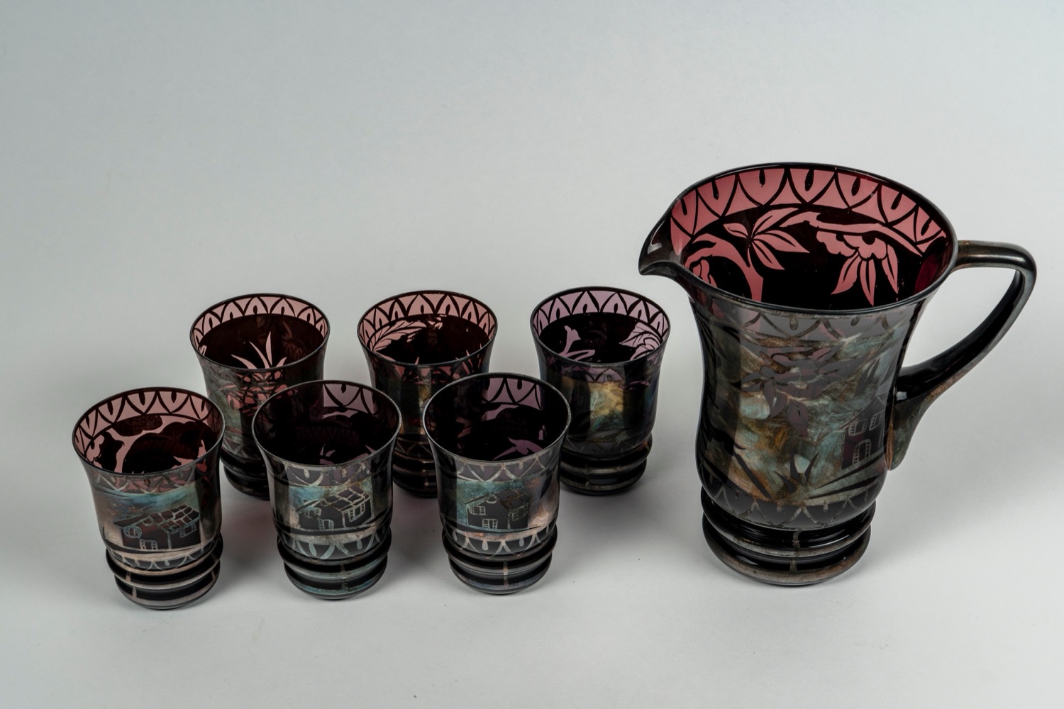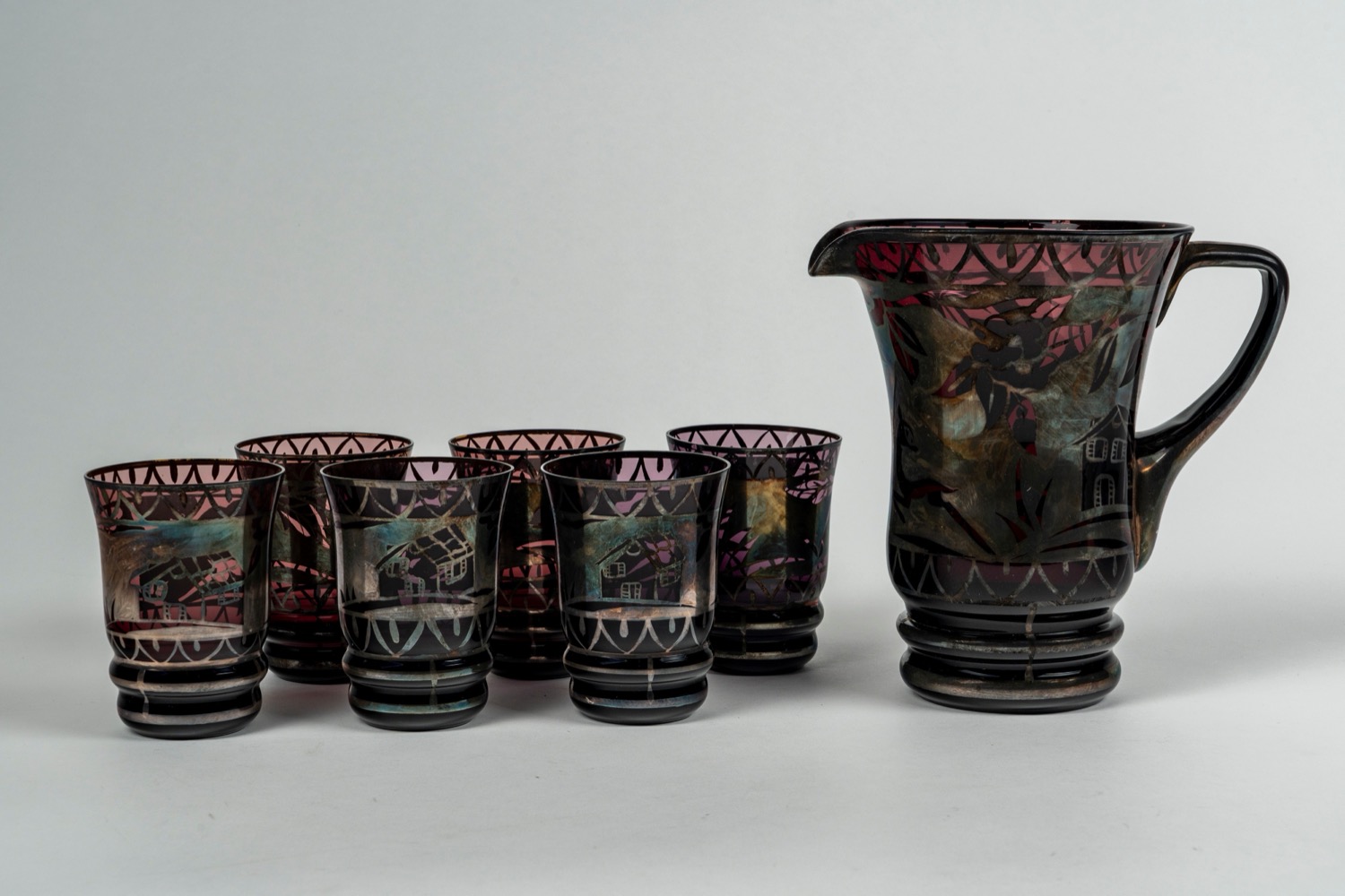 Una brocca e sei bicchieri in vetro color ametista e argentato, 20th century