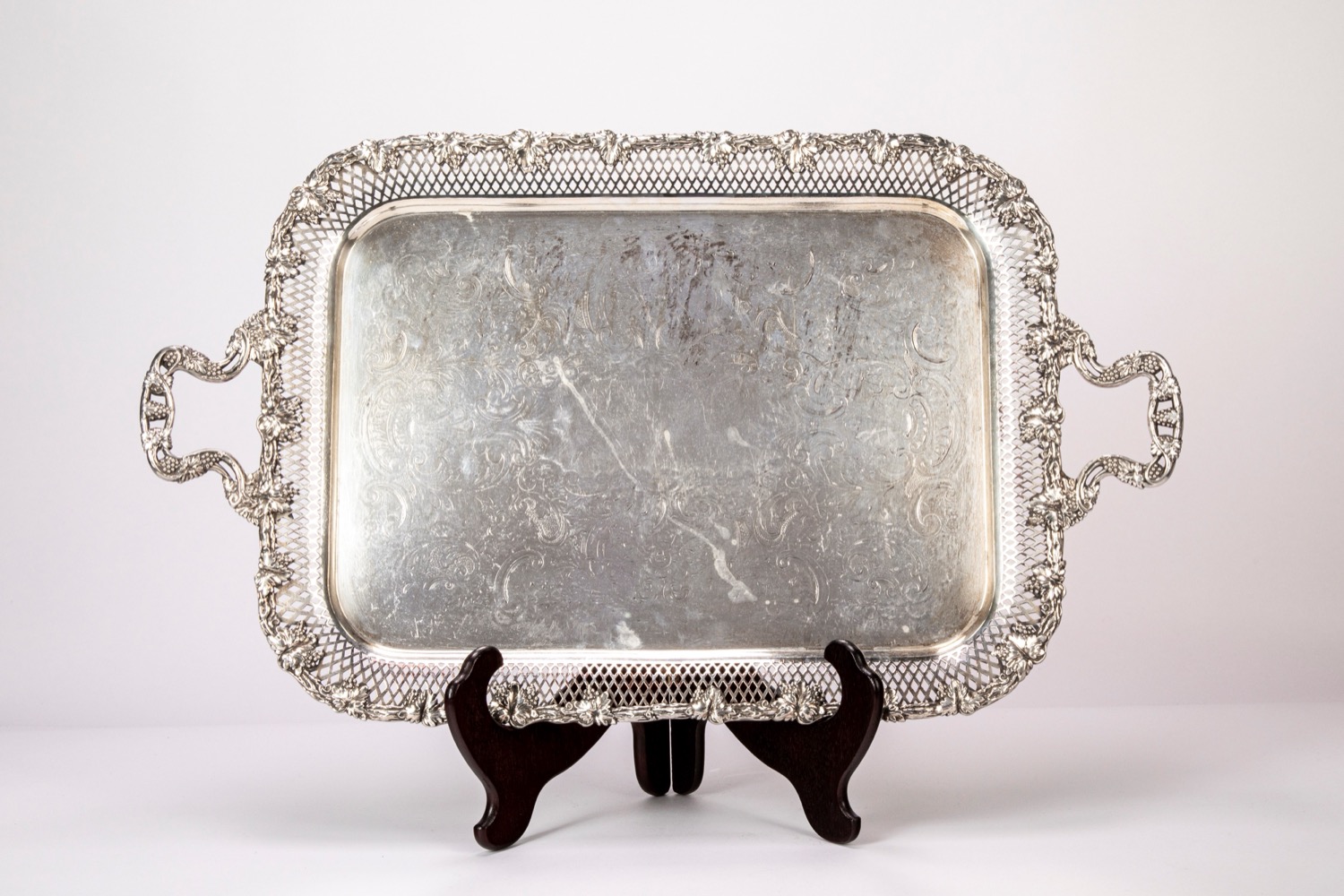 con bordo riccamente cesellato a tralci di vite con uva e traforatura geometrica.