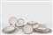 36 piatti piani (diametro cm 24), 12 piatti fondi (diametro cm 24), 11 piatti da frutta (diametro cm 19,5), due zuppiere, un'insalatiera, un piatto da portata tondo, tre piatti da portata ovali di varie misure, due raviere e una salsiera