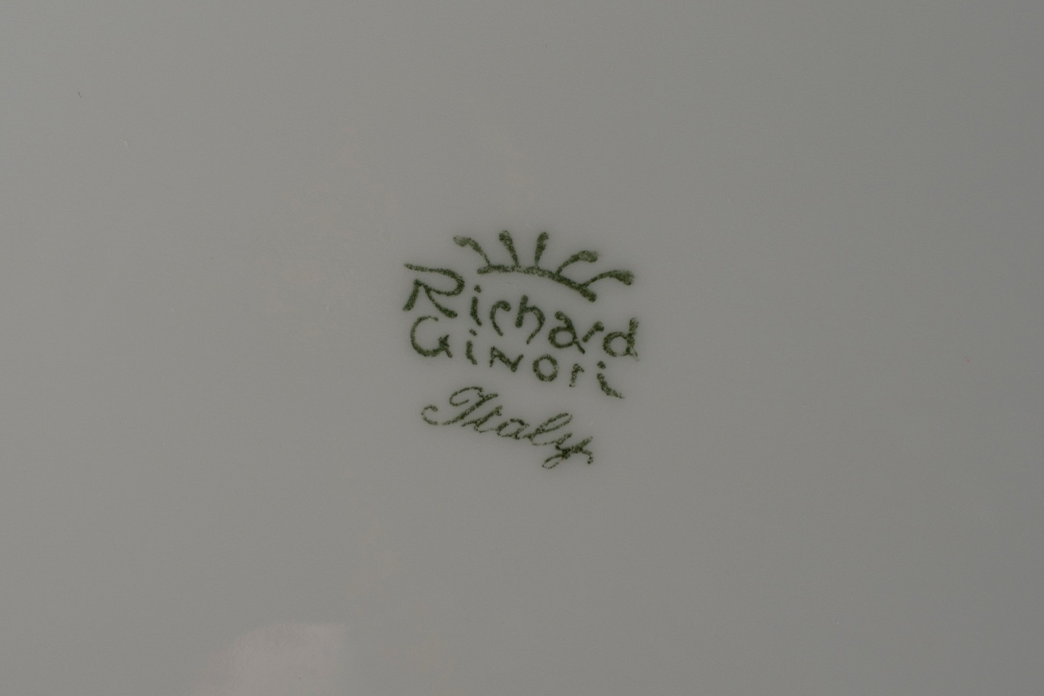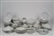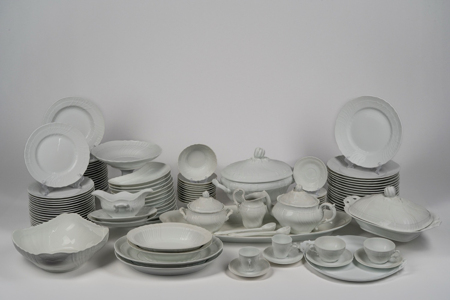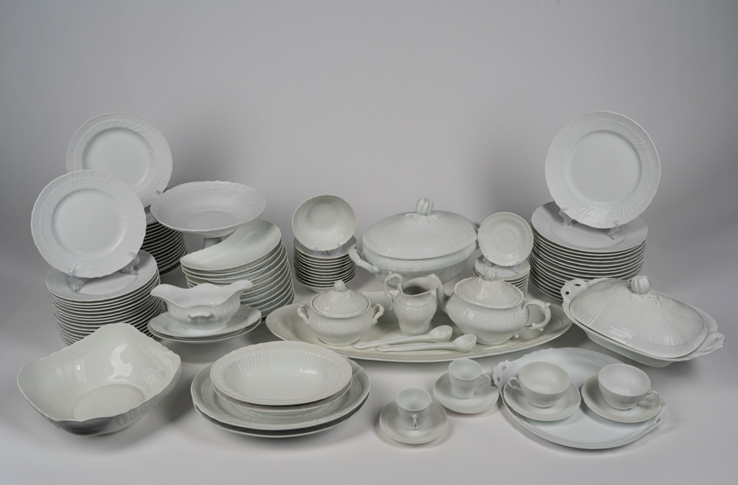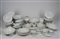 composto da 18 piatti fondi, 17 piani (uno con sbeccature), 18 da antipasto, 1 alzata, 1 vassoio biansato, 3 piatti circolari da portata, 1 insalatiera, 1 pastiera, due vassoi e un vassoietto ovale, 2 ciotole ovali, 12 antipastiere a mezza luna, 12 coppette da macedonia, una legumeria biansata con coperchio, 1 pescera, 1 zuppiera biansata con presa del coperchio a forma di zucca, 1 salsiera con cucchiaio, una teira, una zuccheriera, una lattiera, 6 tazze da te con piattini e 12 tazze da caffe con piattino.
