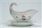 Salsiera a barca con presa a testa di cigno e vassoietto ovale in porcellana decorata “alla rosa” e a fiori sparsi con filetti nei toni del porpora. Germania, Schlagenwal, 1810 circa.