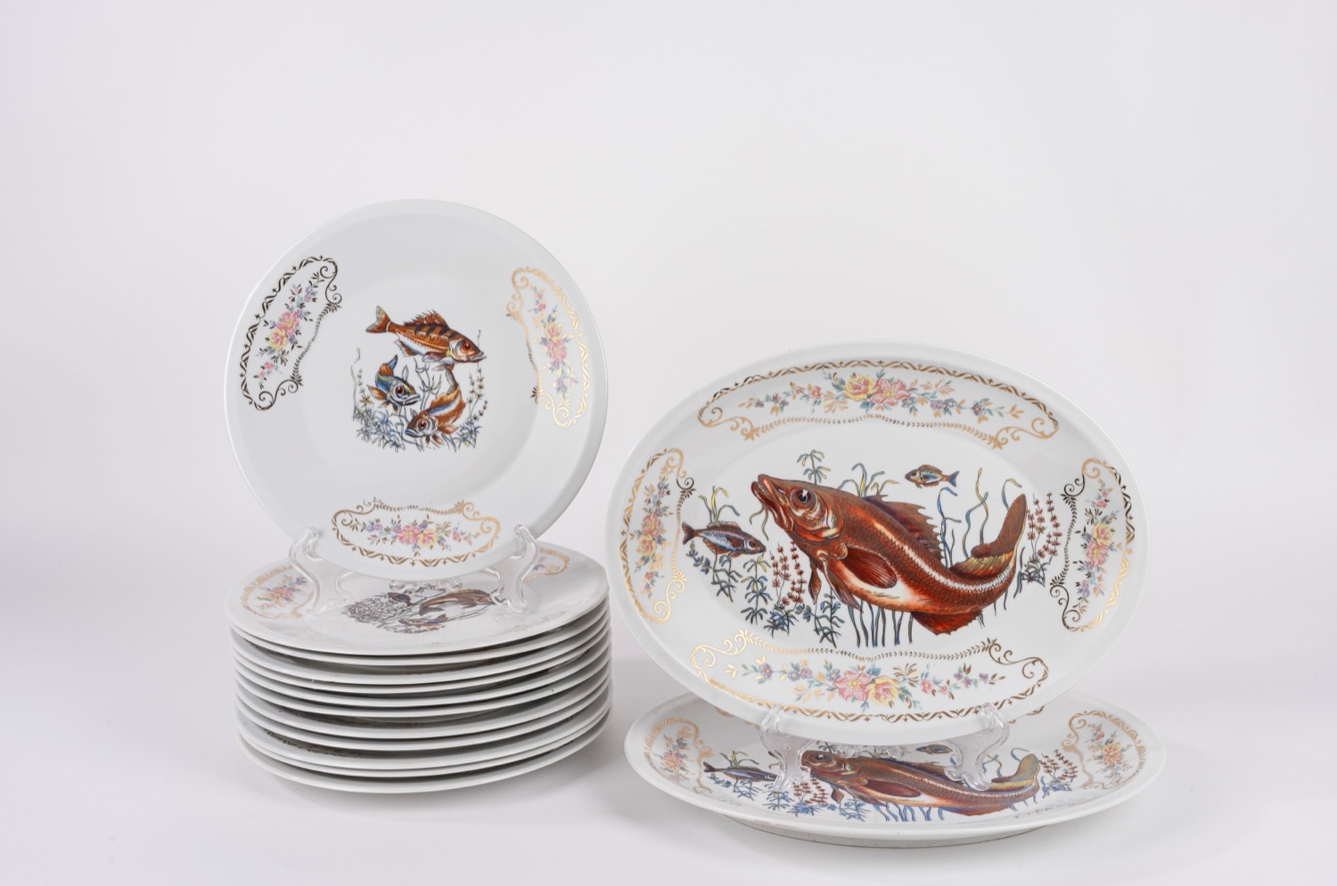 Dodici piatti piani e due da portata, decorati con pesci, Richard Ginori