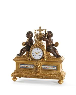 PENDOLA Pendola da tavolo, Francia epoca Napoleone III H 50 48x20 cm, legno, bronzo brunito e dorato Cassa in legno dorato con placche di porcellana di Sevres sormontata da putti suonatori in bronzo brunito, movimento parigino con suoneria delle ore e delle mezze su campanello, quadrante in smalto con numerazione romana firmato Allamano Her à Turin. Note: sul movimento due scritte riportano due riparazioni datate 1860-1862 Completa di chiave e pendolo, revisionata A French Napoleon III bronze table clock