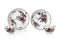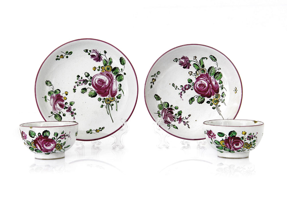 COPPIA DI TAZZE CON PIATTO IN MAIOLICA, PESARO, CASALI E CALLEGARI, 1760 CA., decoro policromo alla rosa con mazzetti e fiori sparsi.