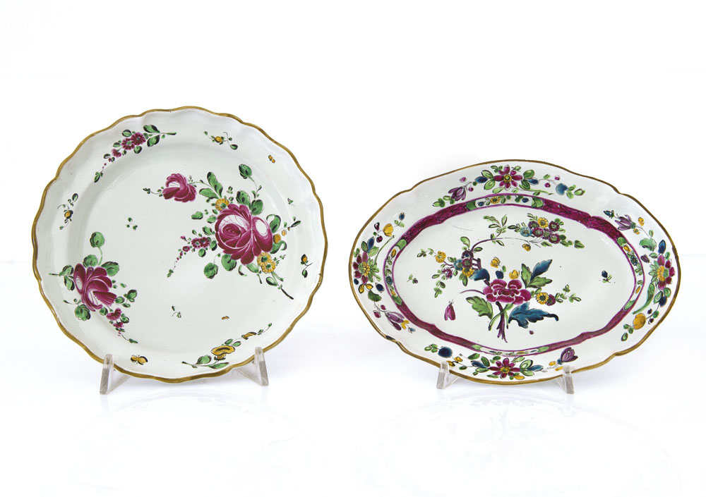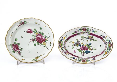 DUE PIATTI IN MAIOLICA, PESARO, CASALI E CALLEGARI, 1760 CA., uno con decoro policromo "alla rosa" e uno ovale con decoro policromo "alla peonia".