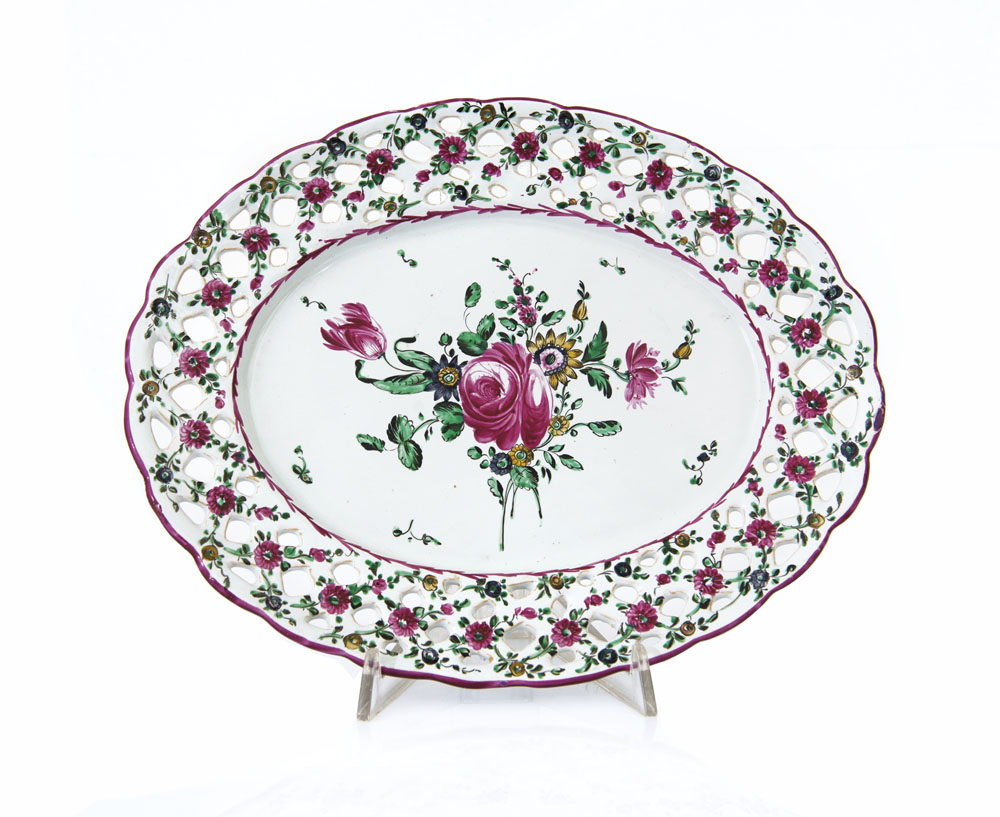 PIATTO IN MAIOLICA, PESARO, CASALI E CALLEGARI, 1760 CA., ovale con bordo traforato, decoro policromo "alla rosa" e fiori sparsi.
