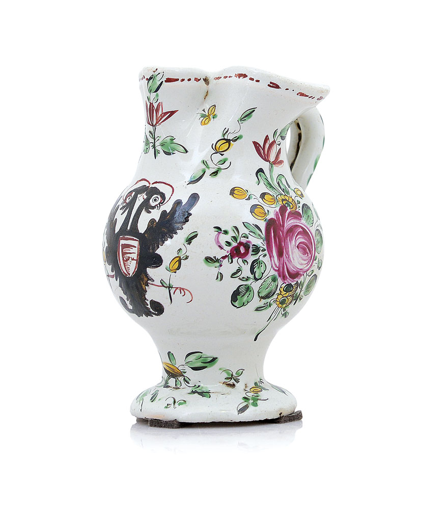 VERSATOIO IN MAIOLICA, PESARO, CASALI E CALLEGARI, 1780 CA., decoro policromo alla rosa con stemma araldico.