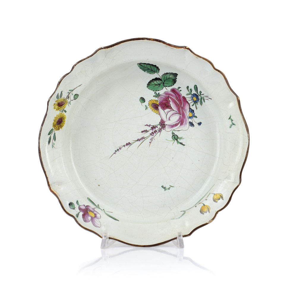 PIATTO IN MAIOLICA, BOLOGNA, FINCK, SECONDA META' XVIII SECOLO, decoro policromo alla rosa contornata; marca "F2"; probabile restauro.